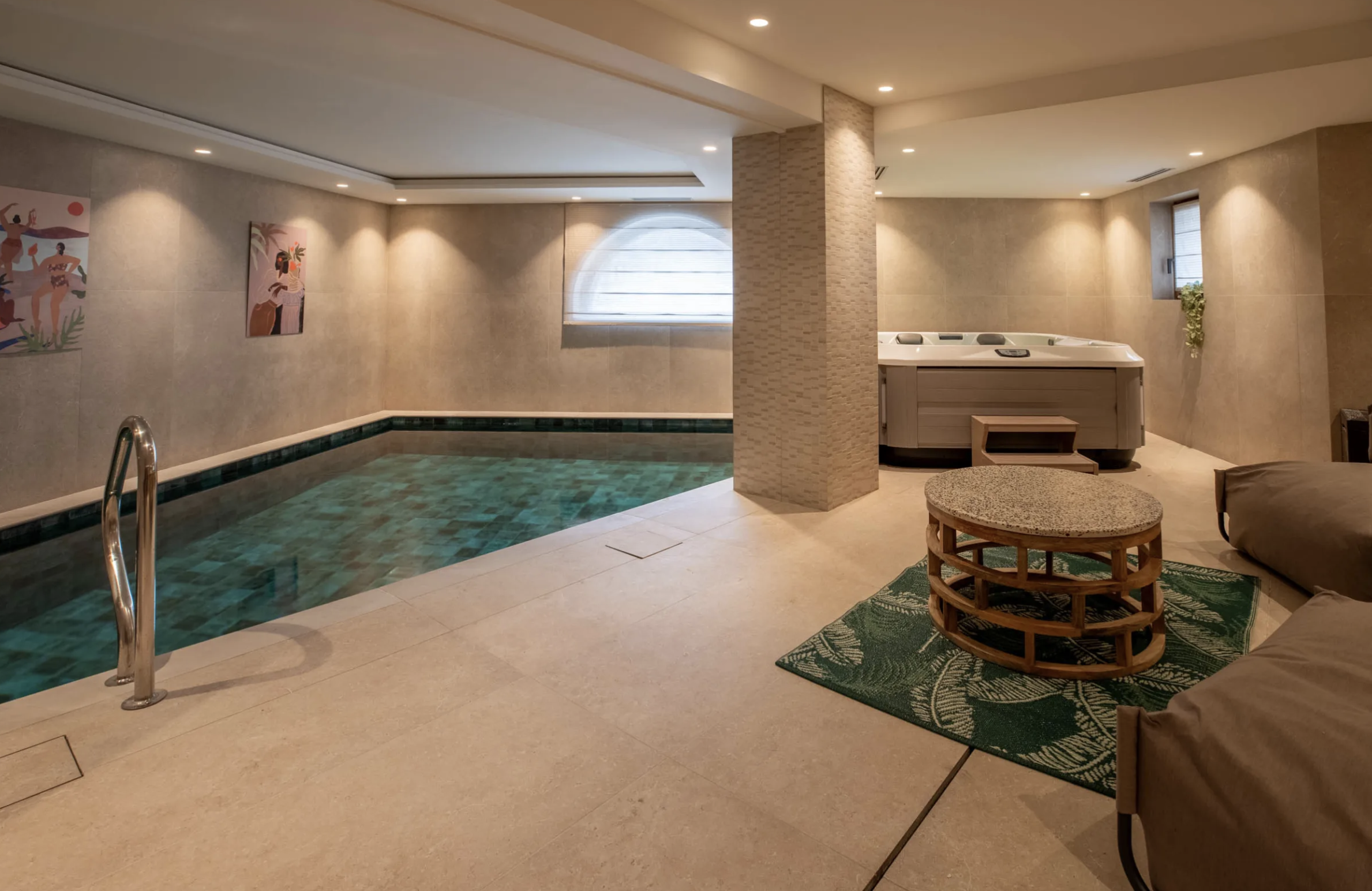 Here you’ll find the chalet’s indoor swimming pool and hot tub, surrounded by a relaxation area and walk-in shower — perfect for easing tired muscles. This level also includes: